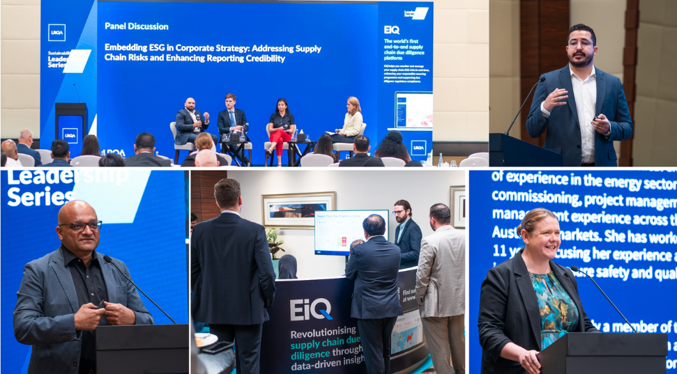 استفاد الفريق من هذه الفرصة لتقديم برنامج EiQ - برنامج LRQA الرائد عالمياً في ذكاء سلسلة التوريد - عبر عرض توضيحي للمنصة التي تتيح للشركات مراقبة وإدارة مخاطر ESG في سلسلة التوريد في الوقت الفعلي.