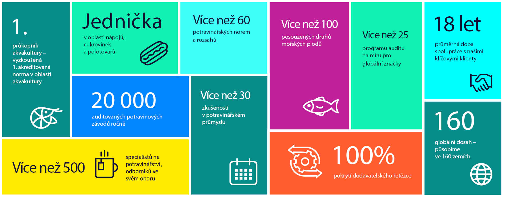 Spolupracujeme s více než 35 000 klienty v potravinářském odvětví. Ať už jste globálním hráčem, nebo malovýrobcem, můžeme Vám pomoci vytěžit z Vašich auditů maximum. Akreditované systémy Vám mohou pomoci ochránit jak reputaci Vaší značky, tak i spotřebitele. Řeší spletitosti rizik napříč dodavatelským řetězcem a zajišťují bezpečnost a udržitelnost potravin. Při řešení zásadních oblastí pro Vaše podnikání Vám mohou pomoci naše doplňkové služby.