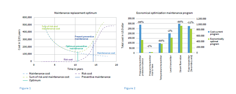 Figure 2 displays the reduction in costs for maintenance and expected risk for the client. For the six assets analysed in this project, an average reduction of 15-20% was reached by optimisating the maintenance strategy and balancing risk withmaintenance cost.