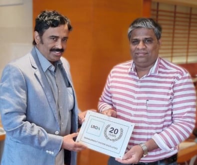 LRQA presents the 20-year award to to Mr Prabhu, AGM, Flowserve Sanmar, for its robust Integrated Management System (IMS).