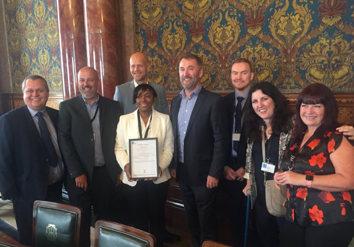Representatives from Vodafone Business attended a certificate presentation on 16 July 2019 at LRQA’s historic head office in Fenchurch Street, London. Following a tour of the Grade II listed building, Abby Thomas, Head of Vodafone Business Customer Operations, was presented with the ISO 9001 certificate by Paul Butcher, Managing Director, LRQA Business Assurance and Inspection Services.