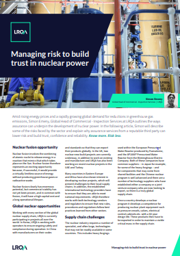 In this article, Simon Emeny, Global Head of Commercial – Inspection Services at LRQA, outlines the ways assurance can underpin the development of nuclear power. Simon describes some of the risks faced by the sector and explains how assurance services from a reputable third party can lower risk and build reliability, trust, and confidence across the nuclear supply chain.