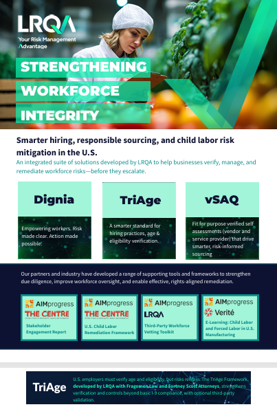 To mitigate this risk, companies need enhanced hiring and monitoring practices that go beyond basic I-9 checks. LRQA, together with Fragomen and FortneyScott, developed the TriAge Framework to support this need. The Framework provides a structured management system for verifying Identity, Age, and Eligibility, using guidance from experienced labor & employment and immigration attorneys. It helps companies build age and eligibility-related controls across operations, which can also include a level of scrutiny over third-party contractors that provide labor at an employer’s worksite or for an employer’s benefit. These controls can then be validated through third-party independent audits.