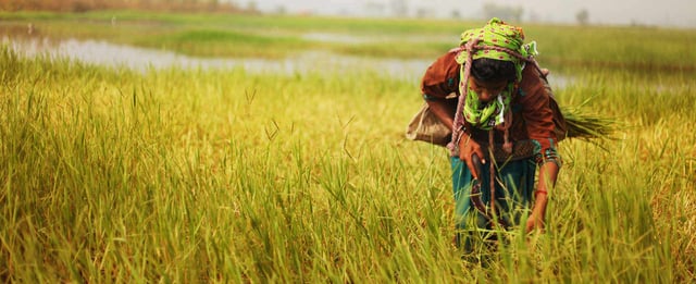 A collage of four scenes — a boat on a turquoise river in a forest, a person in pink fabric against red curtains, a top-down view of chili sorting with a conical hat, and ocean fish farms at sunset with circular nets.
