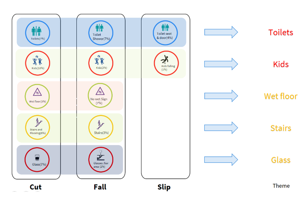 SafetyScanner’s unique ability to identify free text elements and ‘connect the dots’ between identical items but different words (i.e. kid, child, children, babies), proved highly valuable. The tool highlighted the most recurring contributors to the highest risks for customers were – ‘Toilets’, ‘kids’, ‘wet floors’, ‘stairs’ and ‘glass’.