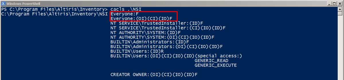 When the Altiris agent performs an inventory scan, e.g. software inventory scan, the SYSTEM level service re-applies the permissions on both the NSI and Outbox folders after the scan is completed.