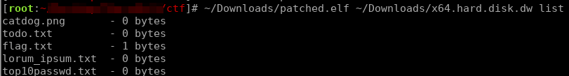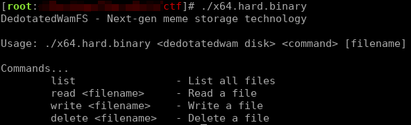 For the hardest of the x64 binary challenges, we were given two files. One represented a custom filesystem image, and the other was a tool that could read from and write to the given custom filesystem image. This fictional filesystem took the name of DedotatedWamFS. Here’s a screenshot of the tool’s functionality.
