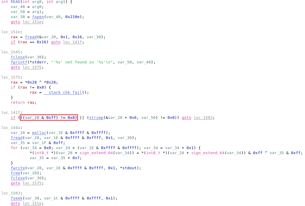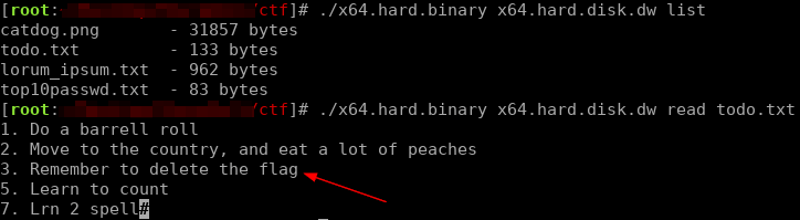 We had found the deleted file – flag.txt. We proceeded to look into the READ sub-routine; once again we identified a simple check to confirm whether the file was deleted or not. We patched that section of the code out and could then read the file.