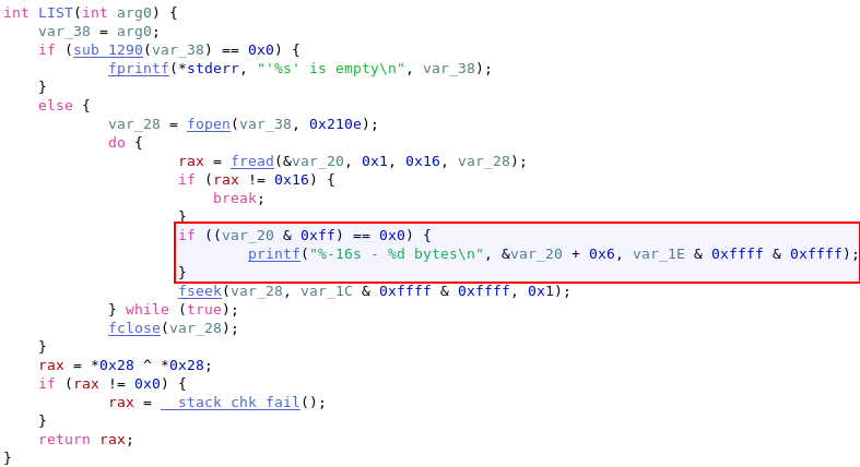 With that in mind, the first thing we needed was the name of the deleted flag file. We looked into the LIST sub-routine, and identified a code section which would only list the file if it had not been deleted, by checking the flag.