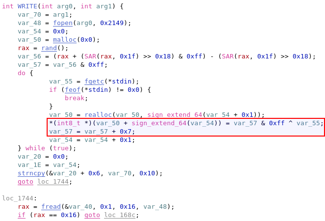 It looked like the deleted flag.txt file was encoded or encrypted. We went a bit further disassembling the executable, into a sub-routine we identified as WRITE.