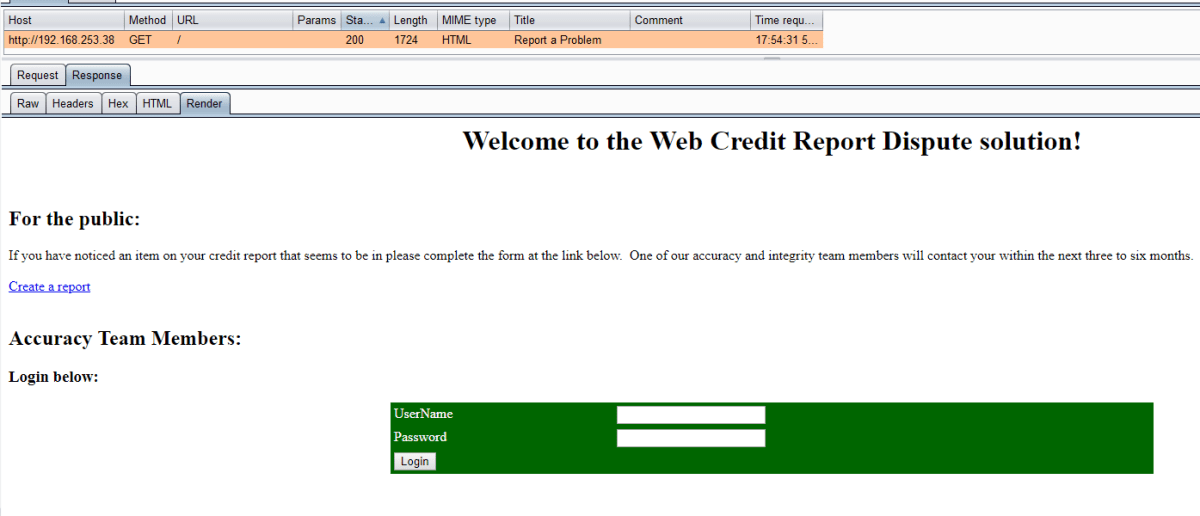 This server hosted a custom credit report dispute application. As a pre-authenticated user we were able to create a dispute, but in order to find more of the functionality, we needed to be able to login.