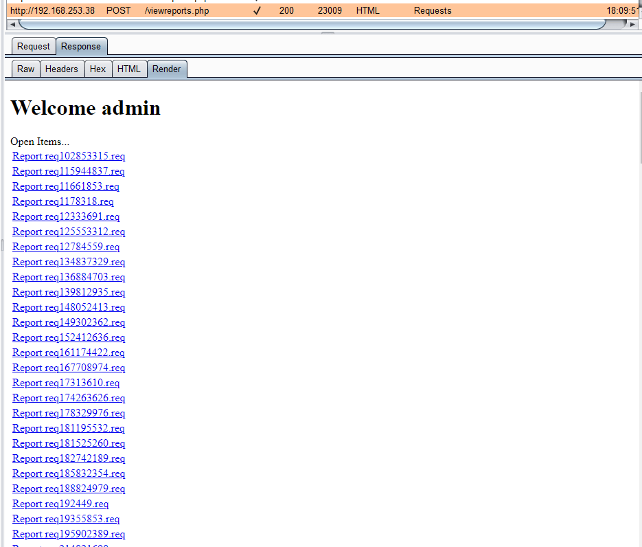 Once we were authenticated, we got to the /viewreports.php page shown below. It contained all of the reports that had been created. Thanks to fellow CTFers’ prodigious use of Burp Suite Active Scan, there were quite a few reports listed. It was also difficult to understand when one was created – something we later found a solution to.