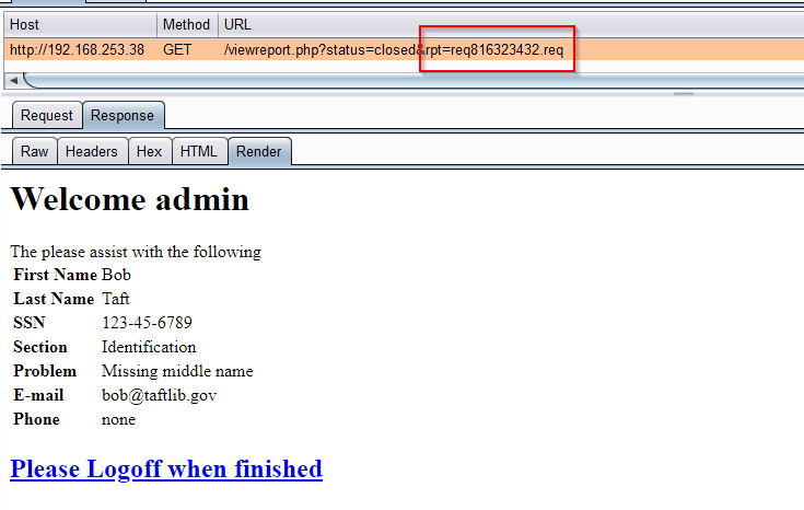 Clicking on any of the links here took you to the /viewreport.php page again, this time detailing all the information that the relevant user had submitted.