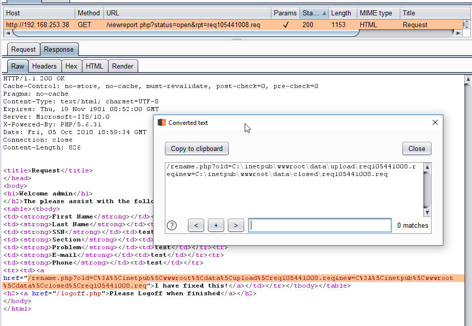 The rpt field was found to have a path traversal vulnerability, but by far the most interesting part of the page was the “I have fixed this!” link. Viewing the source of the page and decoding the URL using the Burp shortcut ctrl+shift+u, we could see that the rename.php page took two parameters, old & new, which just happened to take file paths as values.