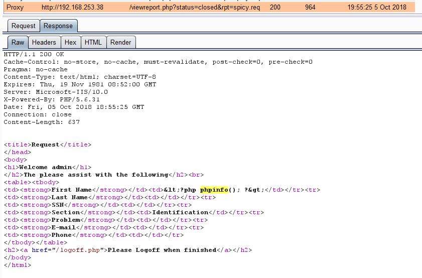 Our immediate thought was to inject PHP via the create report page, locate it on the view requests page, move it so it had a PHP extension, navigate to it and BOOM code execution.