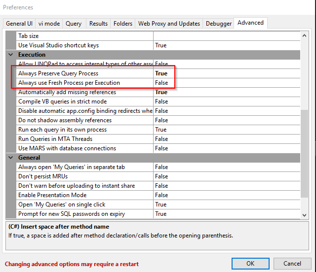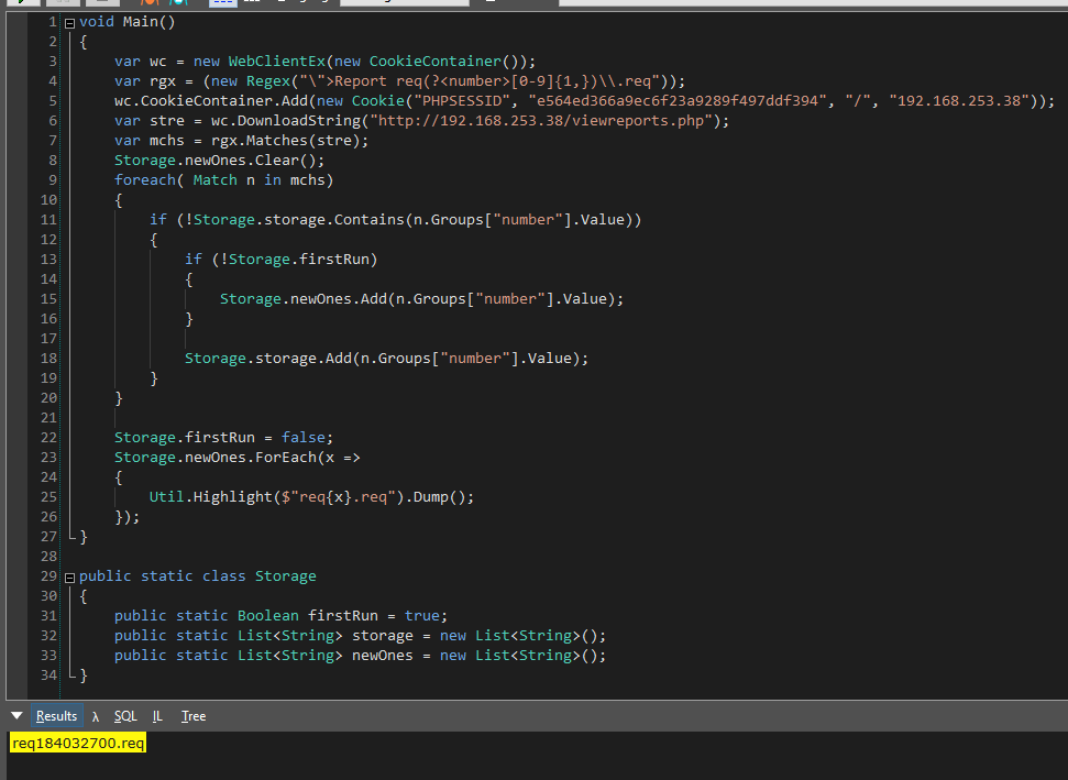 The idea was to write a script that would retrieve the listing of the viewreport.php page, persist the current entries and then on every subsequent run check for any new pages. To persist between runs, a static class with static container members was created. LinqPad can use a new process per run of the script which would destroy our static container. To ensure that the results were persisted between runs, the following settings were created (performed by right clicking the query and selecting properties).