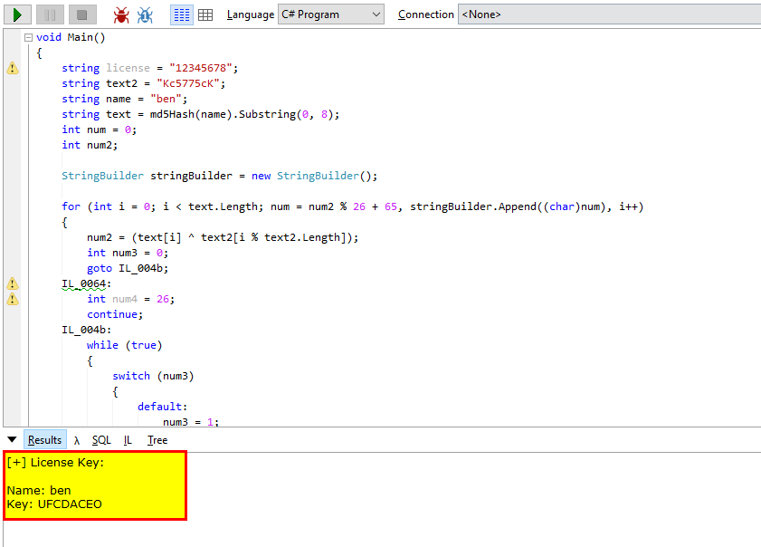 By using the algorithm in the above code, we could simply create our own StringBuilder string and spit it out using LINQPad. There was also some unnecessary code below this, but we didn’t need that to generate the license. Here’s the code for this project and the generated license key.