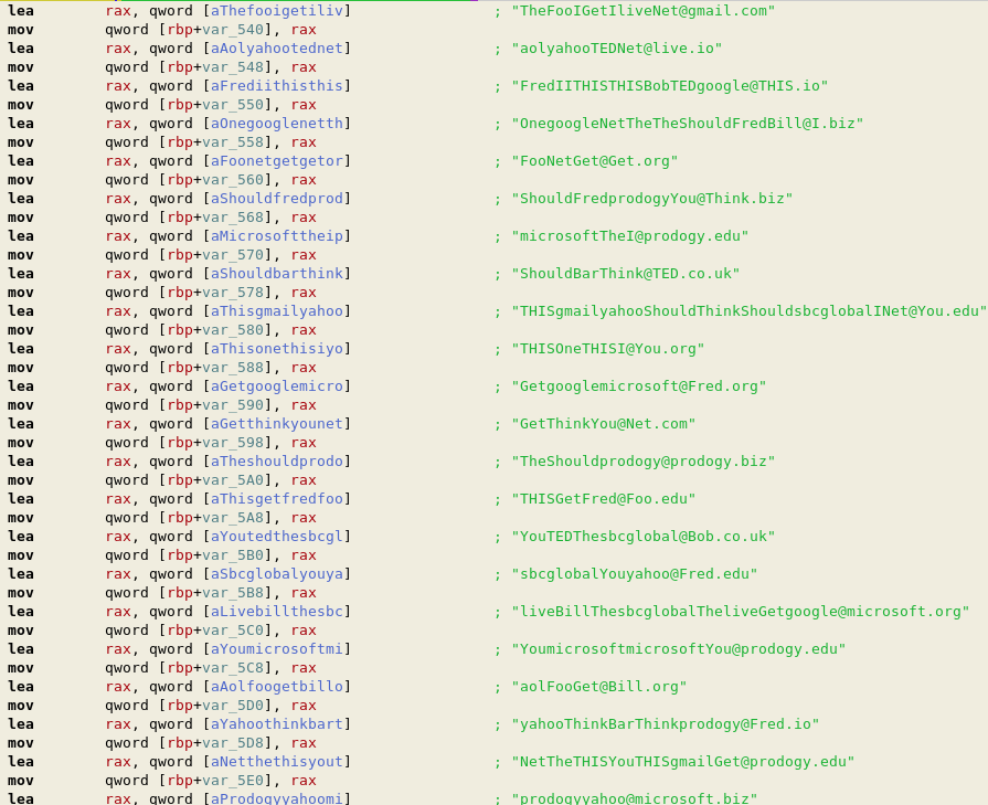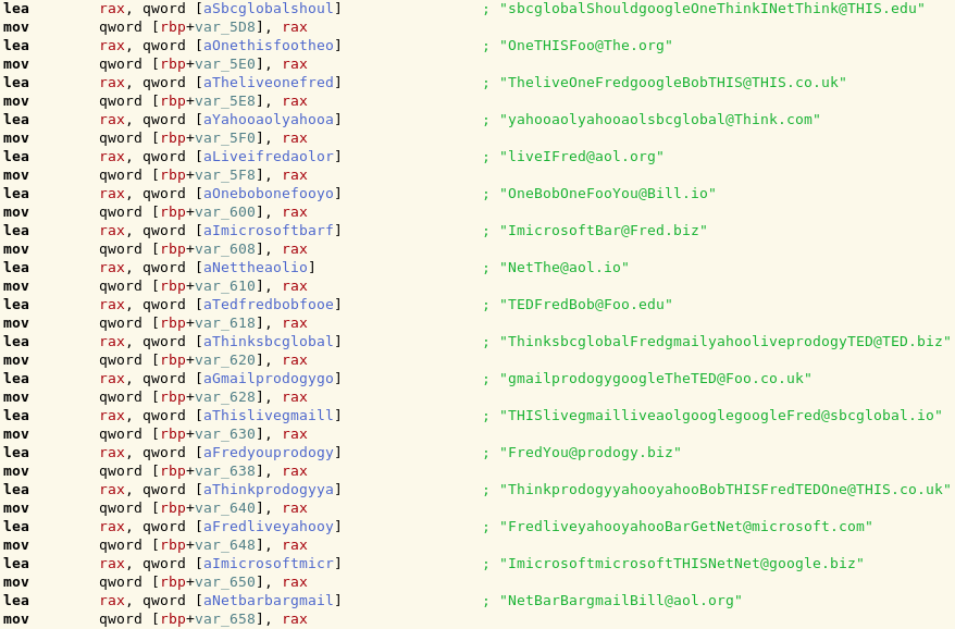 We could see that the user’s input was passed to the _AttemptAuthentication() function as an argument. Looking at that function, we could see that its argument was compared (using strcmp) to aolOneBar@Bill.io – the flag for this challenge.