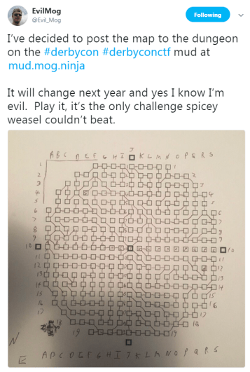 There was a downright evil box that hosted a MUD, courtesy of @Evil_Mog. With the exception of a couple of simple flags, we were unable to gain any traction here. This tweet says it all…