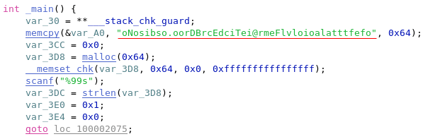 Once again we had a Mach-O 64-bit binary. Similarly to the previous binary, the user was prompted to enter a key when the binary was executed. This time, it looked like things were a bit more complex than a simple strcmp():