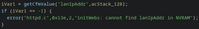 Searching for the error string initWebs: cannot find lanIpAddr in NVRAM in httpd highlights the following code: