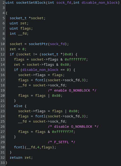 socketSetBlock()  takes a socket file descriptor and a boolean to disable non-blocking mode on the file descriptor. The current file descriptor flags are retrieved at line 17 or 24 and the O_NONBLOCK flags is set / cleared at line 20 or 27. Finally, the new flags value is set for the socket at line 30 with a call to fcntl().