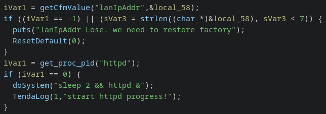 Simple enough. The helpful comment states that netctrl will spawn every other process, which should include the HTTP server. Loading netctrl into Ghidra confirmed this. A call to getCfmValue() is made just before httpd is launched via doSystem().