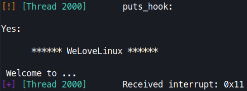 Every call to puts() is now hooked and will call the Python puts_hook() instead. The hook resolves the string argument passed to puts() and then logs it to the terminal. Since QL_INTERCEPT.CALL is used as the last argument to set_api() then only the hook is called and not the real puts() function. Hooks can also be configured to not override the real function by using QL_INTERCEPT.ENTER / QL_INTERCEPT.EXIT instead.