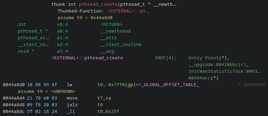 Emulation hangs on the instruction located at 0x0044a8dc. Navigating to this offset in Ghidra shows a thunk that is calling pthread_create() via the global offset table.