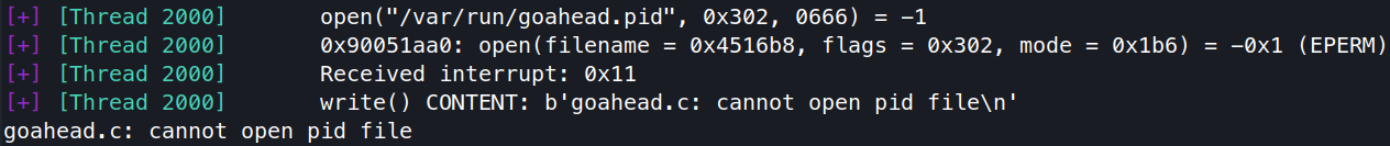 Looking at the extracted root filesystem, the /var/run/ directory doesn't exist. Creating the run directory and an empty goahead.pid file inside the extracted root filesystem gets past this error.