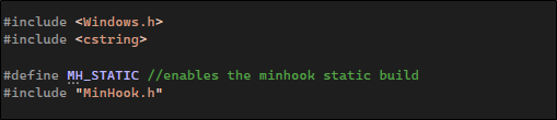 To do that, we define MH_STATIC so it will link directly to the MinHook source files we include in our code directory.