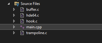 I took buffer.c, hook.c, trampoline.c and hde64.c and place it in the same directory as my code. Next, I also added the MinHook include directory to our project.