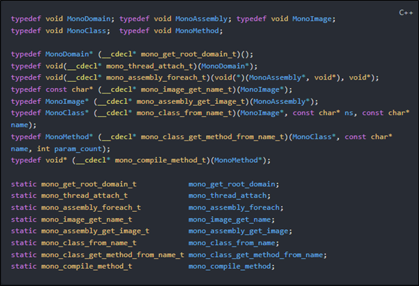 The following shows the declarations of the blueprints for Mono's API so that my DLL can speak to the embedded Mono runtime.