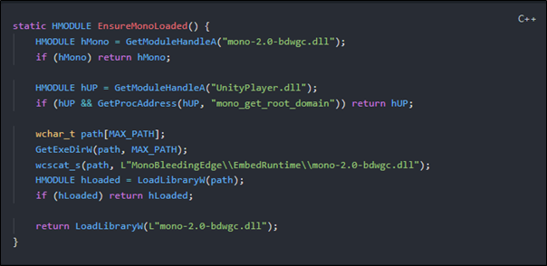 First, it checks if mono-2.0-bdwgc.dll is already loaded. If not, it falls back to inspecting UnityPlayer.dll, since some games bundle Mono there. And if that still doesn’t work, it tries the well-known installation path.