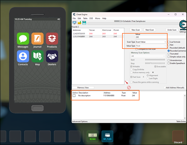 First things first, the starting point of most game hacking - we want infinite money. We turn to Cheat Engine (CE) to pinpoint the memory address that's storing the value of the cash on hand we're targeting.