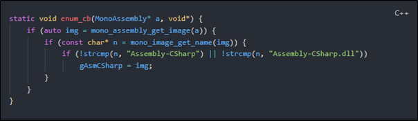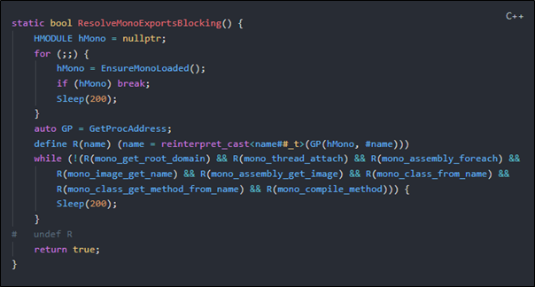 In this section (assuming that Mono has been found), this function will be trying to get the memory address of all those exported functions inside the Mono DLL which will be coming in handy for us later.