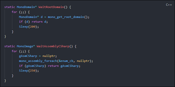 Even though we’ve hooked into Mono, we can’t assume that the game has finished setting up everything by the time our DLL loads. If we are doing things faster than the game loads, we’ll most likely just mess up the game.