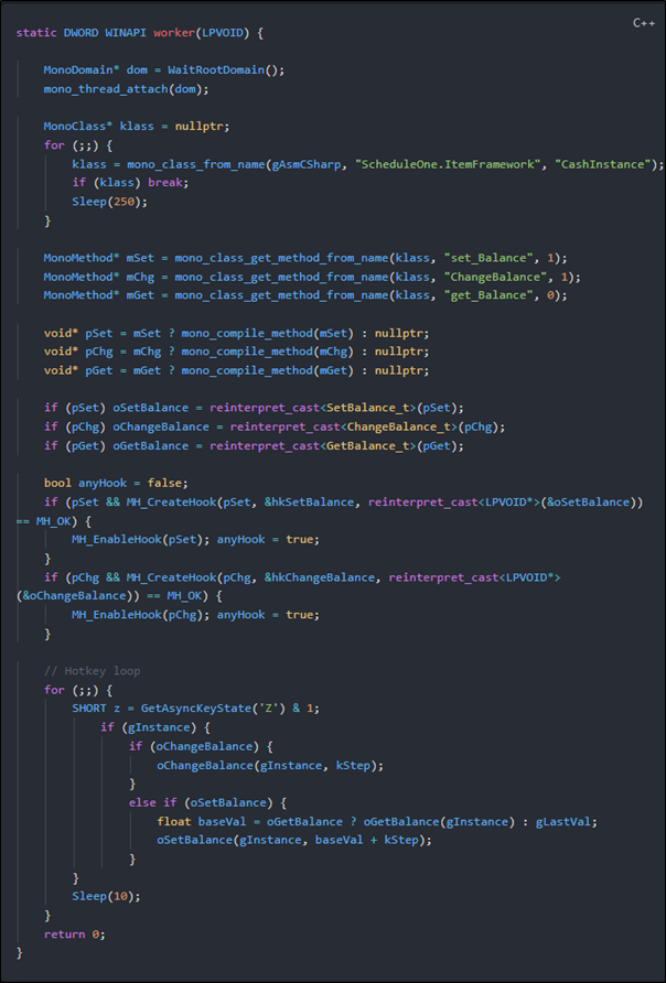 This is the thread that does all the setup (loads all the Mono function pointers, attaching our thread to Mono, find the class "ScheduleOne.ItemFramework.CashInstance", resolve the methods, JIT compiles them, create hooks, loop to top-up money) and then sits in a loop waiting for us to press 'Z'.
