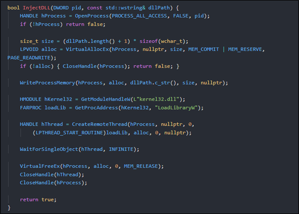 To start the injection, the injector first needs to locate the target process. Using CreateToolhelp32Snapshot, it takes a snapshot of all running processes. The injector then loops through this snapshot, checking each entry until it finds the process with the matching name.