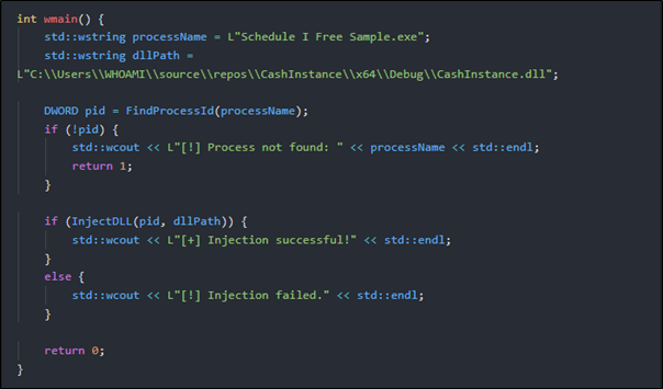 To verify that the DLL was successfully loaded, the hooks were executed, and the instance was captured, I added conditional message box pop-ups as clear indicators.