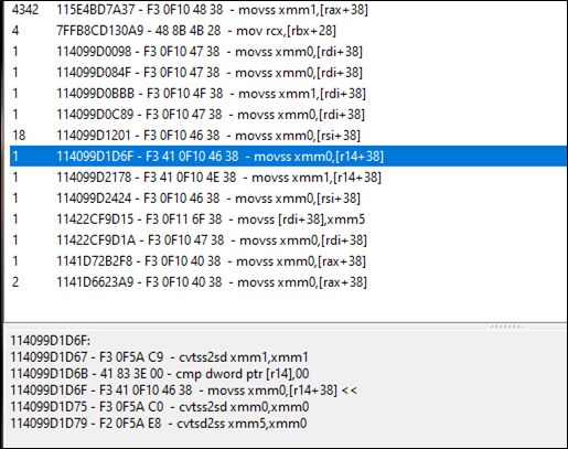 It shows up with three instructions, and we can then reduce the cash one more time to see which instruction it invoked. Turns out, there are lots of movss (move scalar single-precision) which shows they are moving floating-point number from the respective registers.