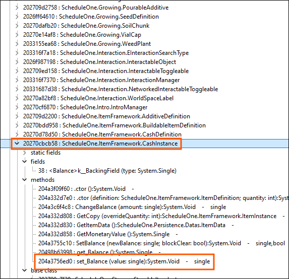 Searching for the class name “CashInstance” brought us to something, and inspecting its methods confirms that it does indeed contain “setBalance” and “set_Balance”.