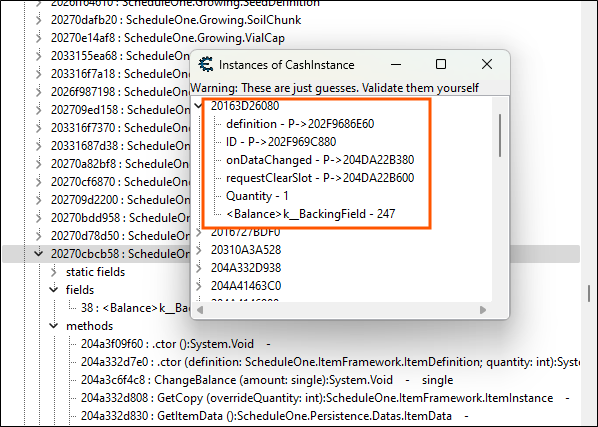 To validate whether this is the right location, we can right click on the fully qualified method name of "ScheduleOne.ItemFramework.CashInstance" and find instances of the class. Many instances would pop up, but we must pinpoint to the one that's holding the value of our cash.