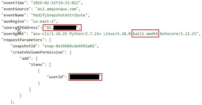 The sourceIPAddress is the IP address from where the attacker issued the AWS CLI command. The userAgent, as you can see, also includes the hostname from where the AWS CLI command was issued. @thesubtlety has written an interesting post on how to overcome this: https://www.thesubtlety.com/post/patching-boto3-useragent/