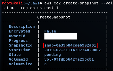 aws ec2 create-snapshot --volume-id vol-0ffdb5642fa255c81 --profile victim --region us-east-1