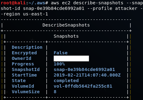 aws ec2 describe-snapshots --snapshot-id snap-0e39b84cde6992a01 --profile attacker --region us-east-1