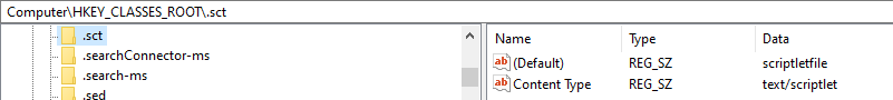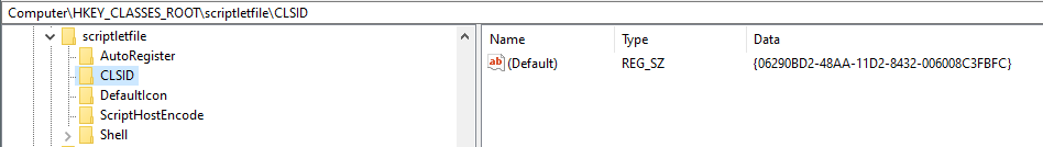 As the moniker is a composite moniker, the two parts must first be bound before the pointer is returned to the calling application. Internally the BindToObject() method is called for the ‘New’ moniker, with an argument *pmkToLeft provided as a pointer to the file moniker. This means that before the new object is bound an object is created with a type determined by the extension of the path provided in the file moniker (.sct in this case). From the registry, it’s possible to see a .sct file (scriptletfile – text/scriptlet) corresponds to a CLSID of {06290BD2-48AA-11D2-8432-006008C3FBFC}: