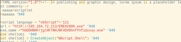 The scriptlet file is included in the RTF file using a Package object. This allows for an arbitrary file to be embedded into the document, and when the document is edited be written into %TEMP%. The scriptlet file is an interpreted COM component containing an XML representation of a script. In this case, it’s a lightly obfuscated Visual Basic script which will download a payload, save it to %APPDATA% and execute it: