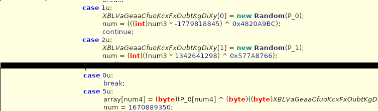Because the two pseudo-random generators are always seeded with the same values (P_0=-1670293239 and P_1=625367976), we can create the same key sequence and decrypt the resource to obtain the clear-text executable.